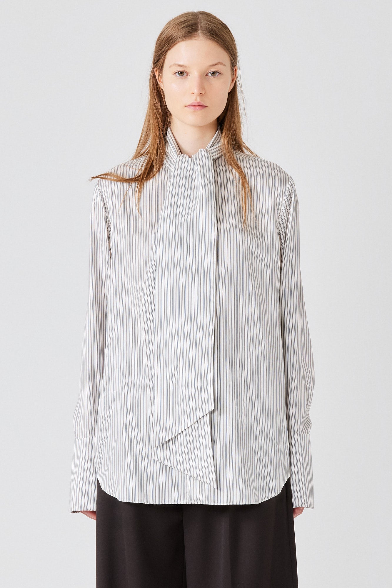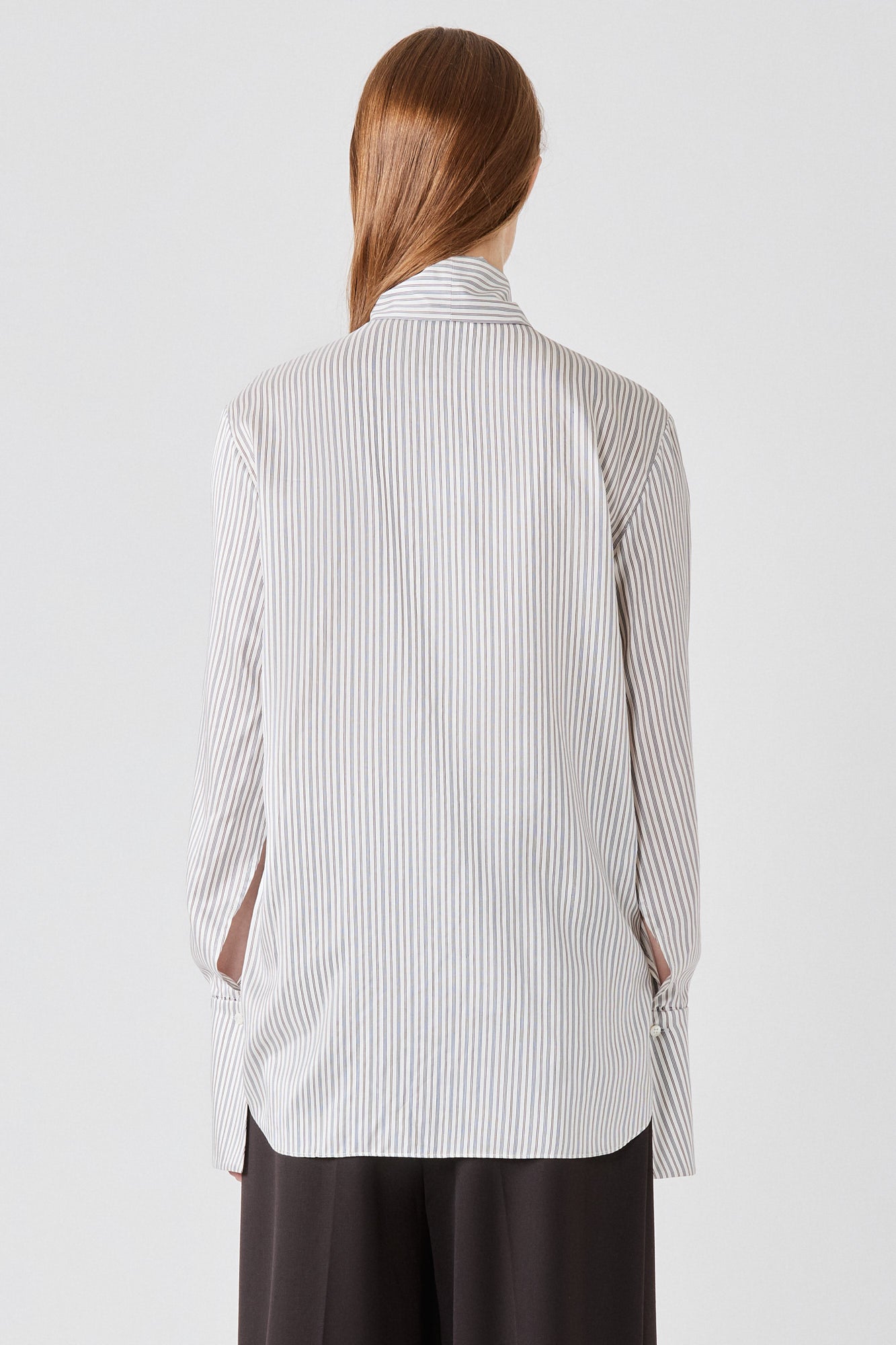 Crafted from pure silk, this silk twill shirt redefines classic shirting with a scarf detail that adds sculptural movement and modern elegance. Designed with a soft drape and clean lines, it offers a refined silhouette that transitions seamlessly from day to evening.