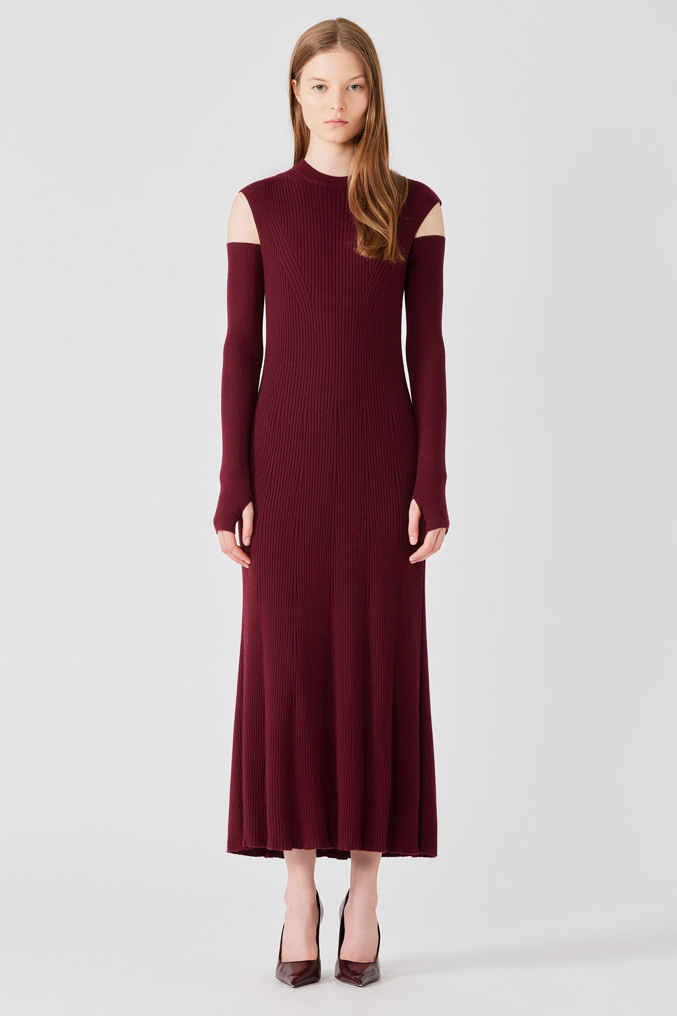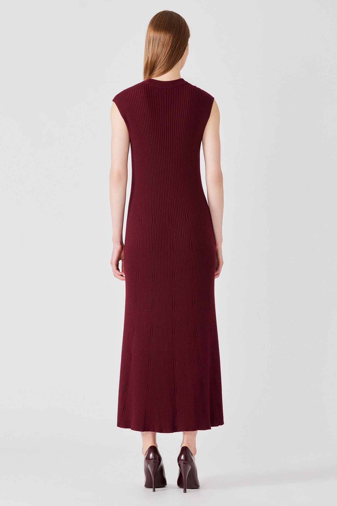 Realizzato in un morbido mix di cashmere e seta, questo abito lungo senza maniche presenta una texture a coste e una gonna leggermente svasata. Il corpo aderente e la scollatura pulita creano una silhouette allungata, perfetta da indossare da sola o abbinata al mantello coordinato per un look più sofisticato.