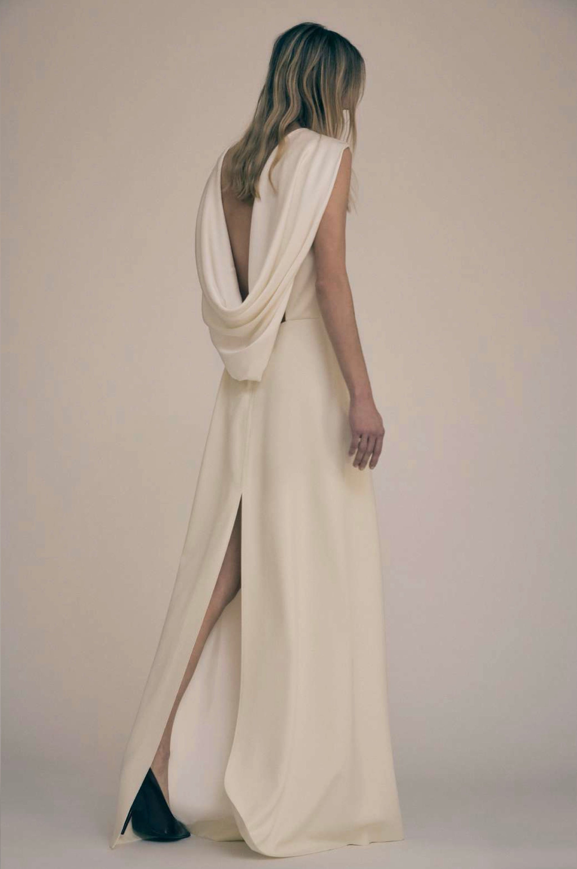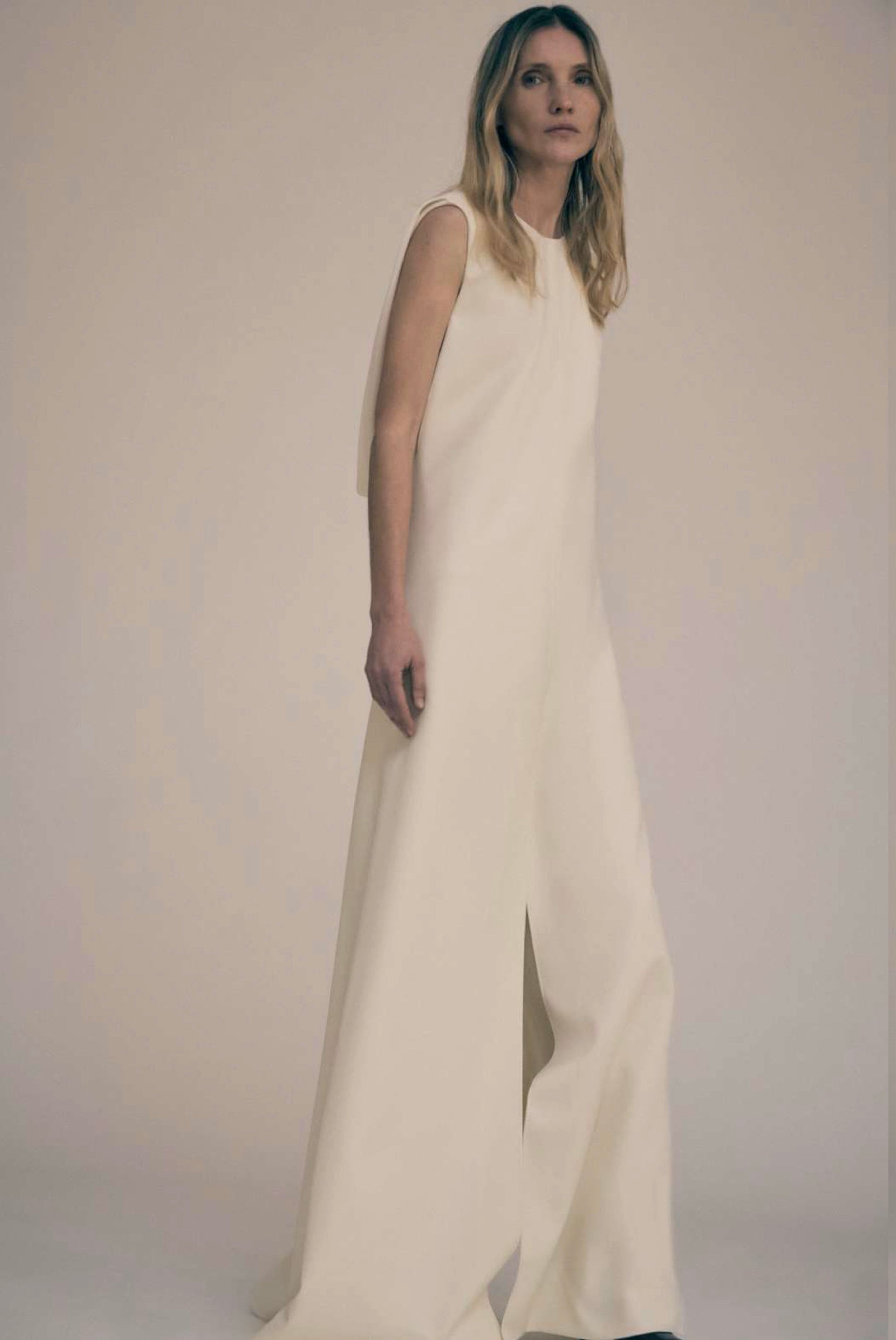 Realizzato in pura lana, l'abito Tuxedo presenta una silhouette a colonna senza maniche con un drammatico schienale scoperto. Un doppio drappeggio in raso scende dalle spalle, aggiungendo un contrasto fluido e un movimento elegante. Progettato per serate audaci o cerimonie moderne, questo capo offre una sofisticazione sorprendente da ogni angolazione.
