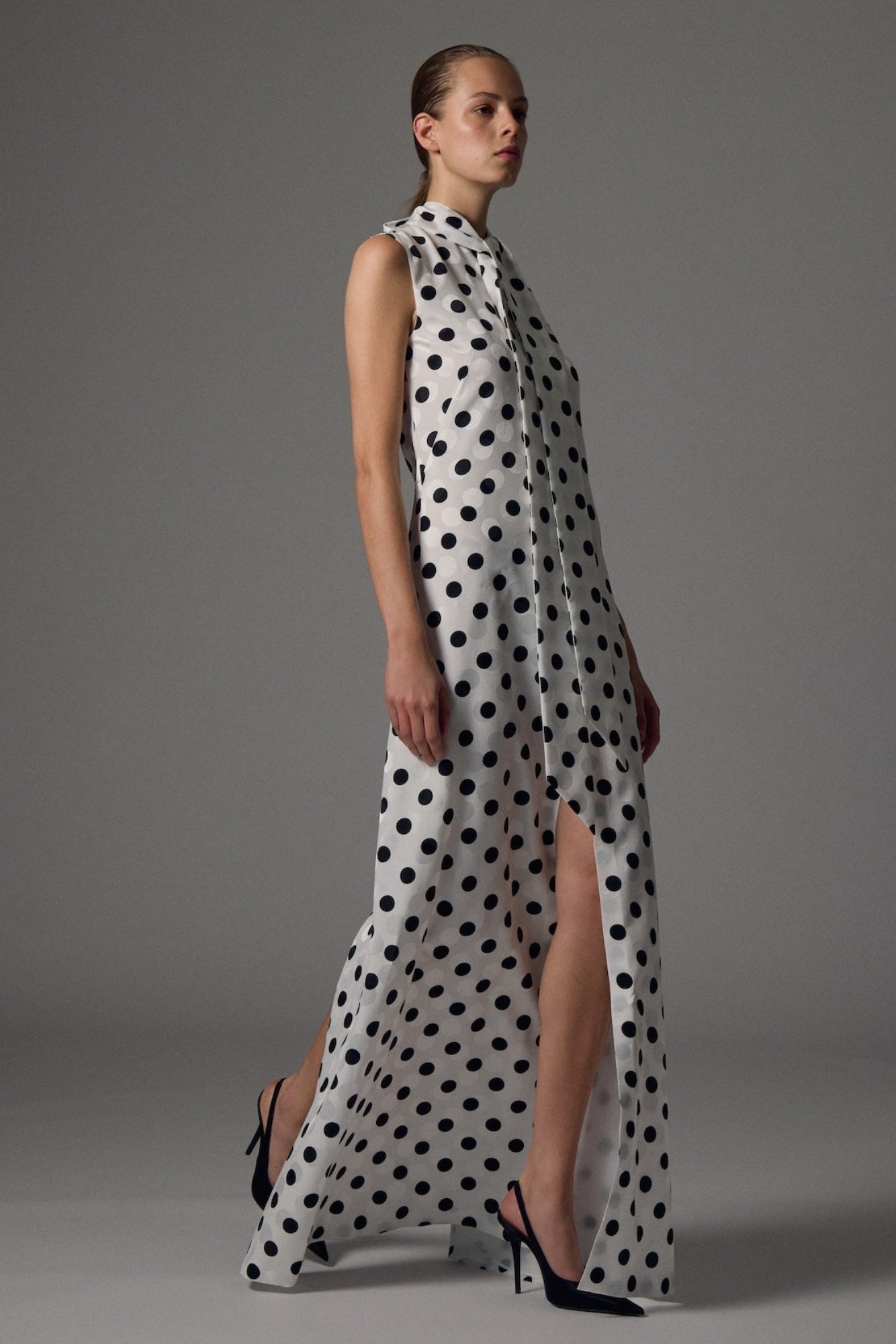 Realizzato in pura lana, l'abito Tuxedo presenta una silhouette a colonna senza maniche con un drammatico schienale scoperto. Un doppio drappeggio in raso scende dalle spalle, aggiungendo un contrasto fluido e un movimento elegante. Progettato per serate audaci o cerimonie moderne, questo capo offre una sofisticazione sorprendente da ogni angolazione.