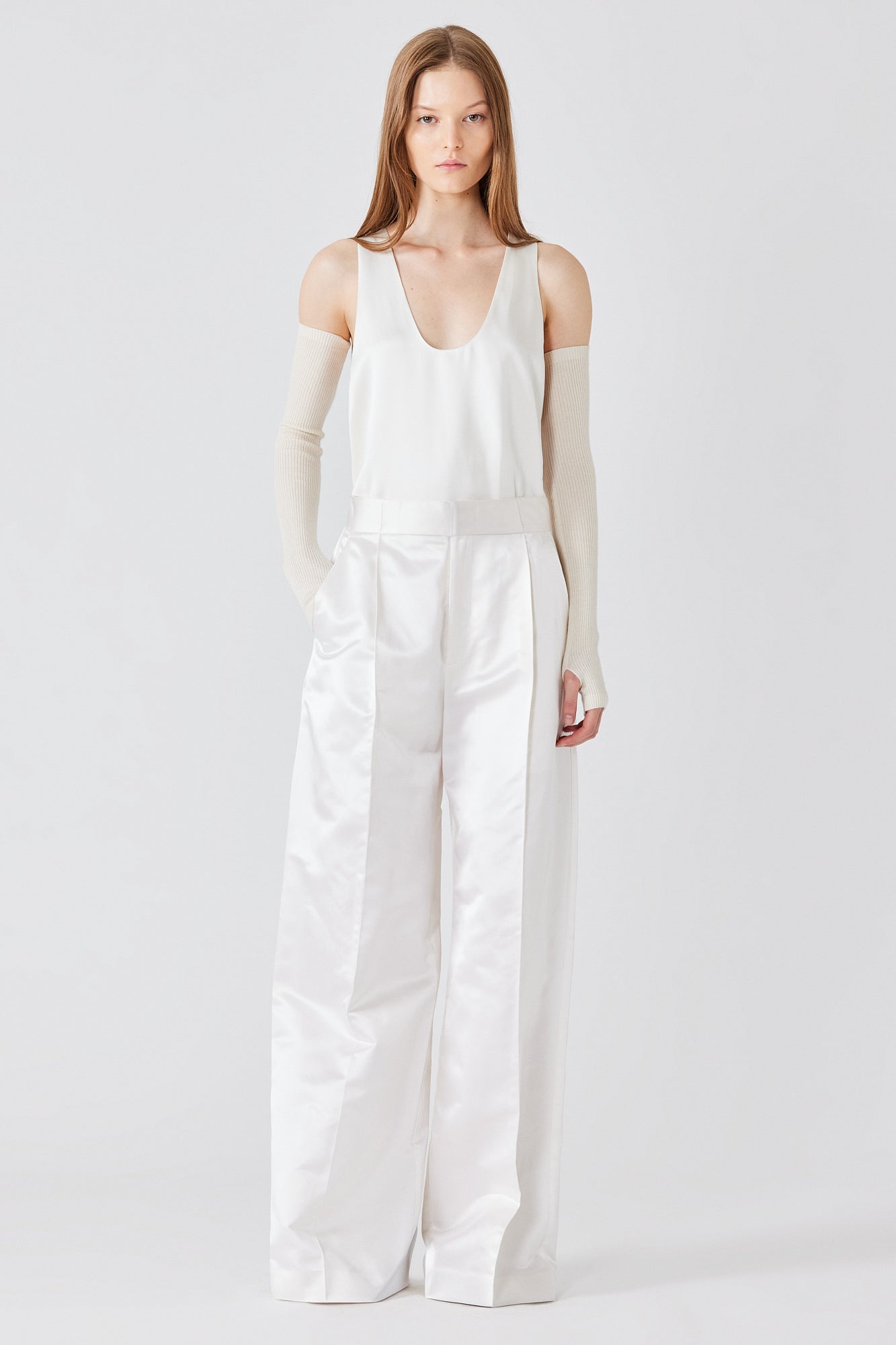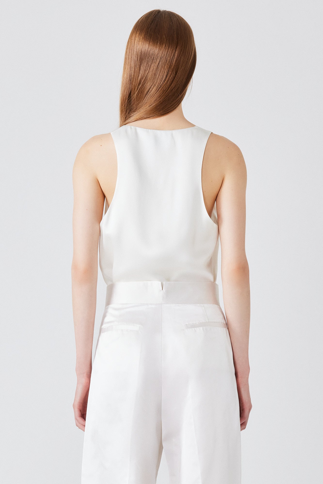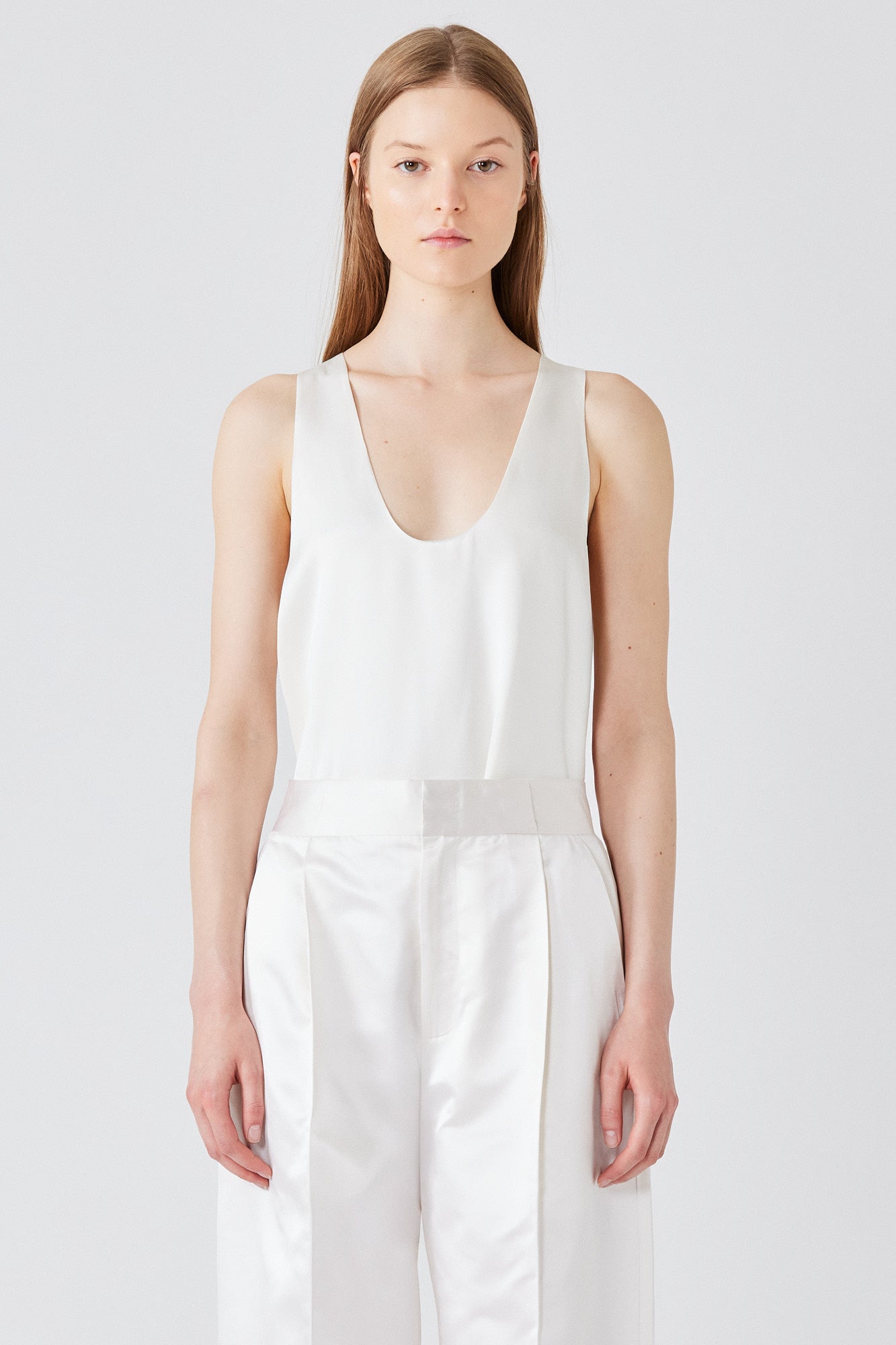 Realizzato in doppio satin fluido, il Top a Canotta presenta una silhouette rilassata con una scollatura dolcemente arrotondata. La caduta lussuosa e la finitura luminosa offrono una base raffinata, ideale per un tailoring strutturato, un'eleganza casual o un abbigliamento serale sofisticato.