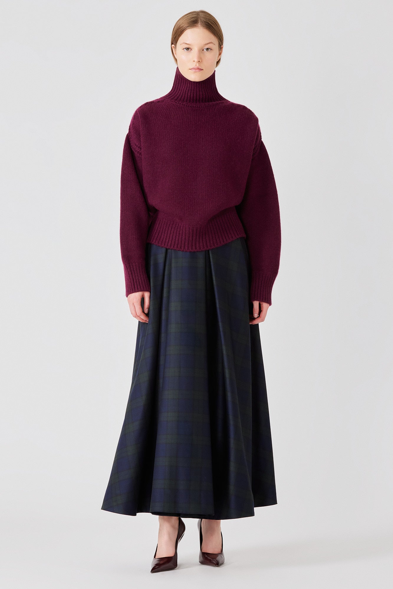 Realizzato in puro cashmere, il maglione Gaia a collo alto presenta una vestibilità rilassata con spalle scese e un collo a dolcevita ampiamente a coste. Una spaccatura posteriore aggiunge movimento e comodità inaspettati, bilanciando morbidezza e dettagli architettonici, ideale per essere indossato a strati durante le stagioni.