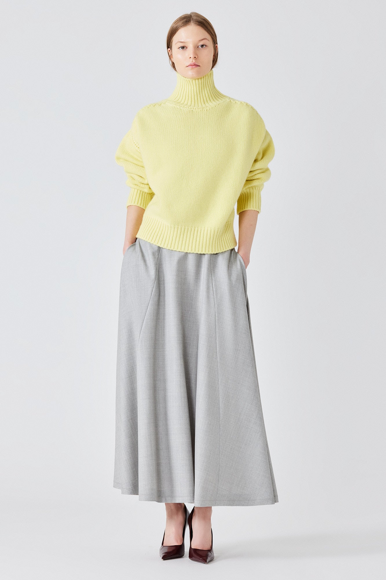 Realizzato in puro cashmere, il maglione Gaia a collo alto presenta una vestibilità rilassata con spalle scese e un collo a dolcevita ampiamente a coste. Una spaccatura posteriore aggiunge movimento e comodità inaspettati, bilanciando morbidezza e dettagli architettonici, ideale per essere indossato a strati durante le stagioni.