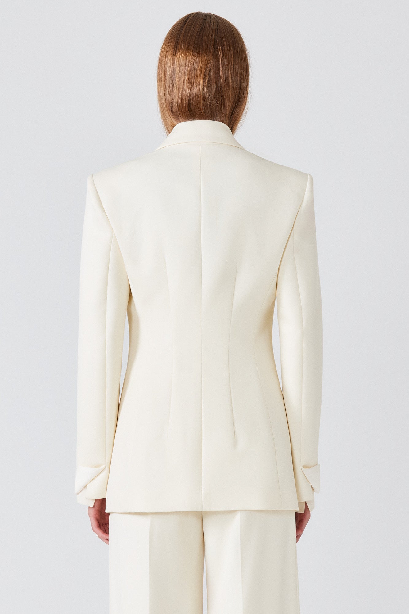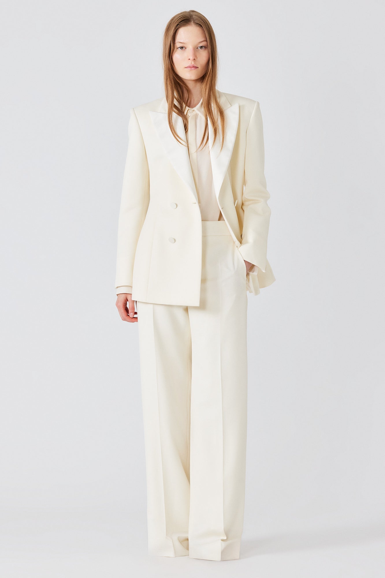 La giacca da smoking è realizzata in pura lana e caratterizzata da un taglio doppiopetto netto e da rever a punta rivestiti in seta. Strutturata sulle spalle con una vita sagomata, richiama i codici senza tempo dell’abbigliamento da sera con un’attitudine decisamente moderna. Abbinala a pantaloni in lana a gamba larga per un look deciso, oppure indossala sopra un abito di seta per un’eleganza da sera raffinata.