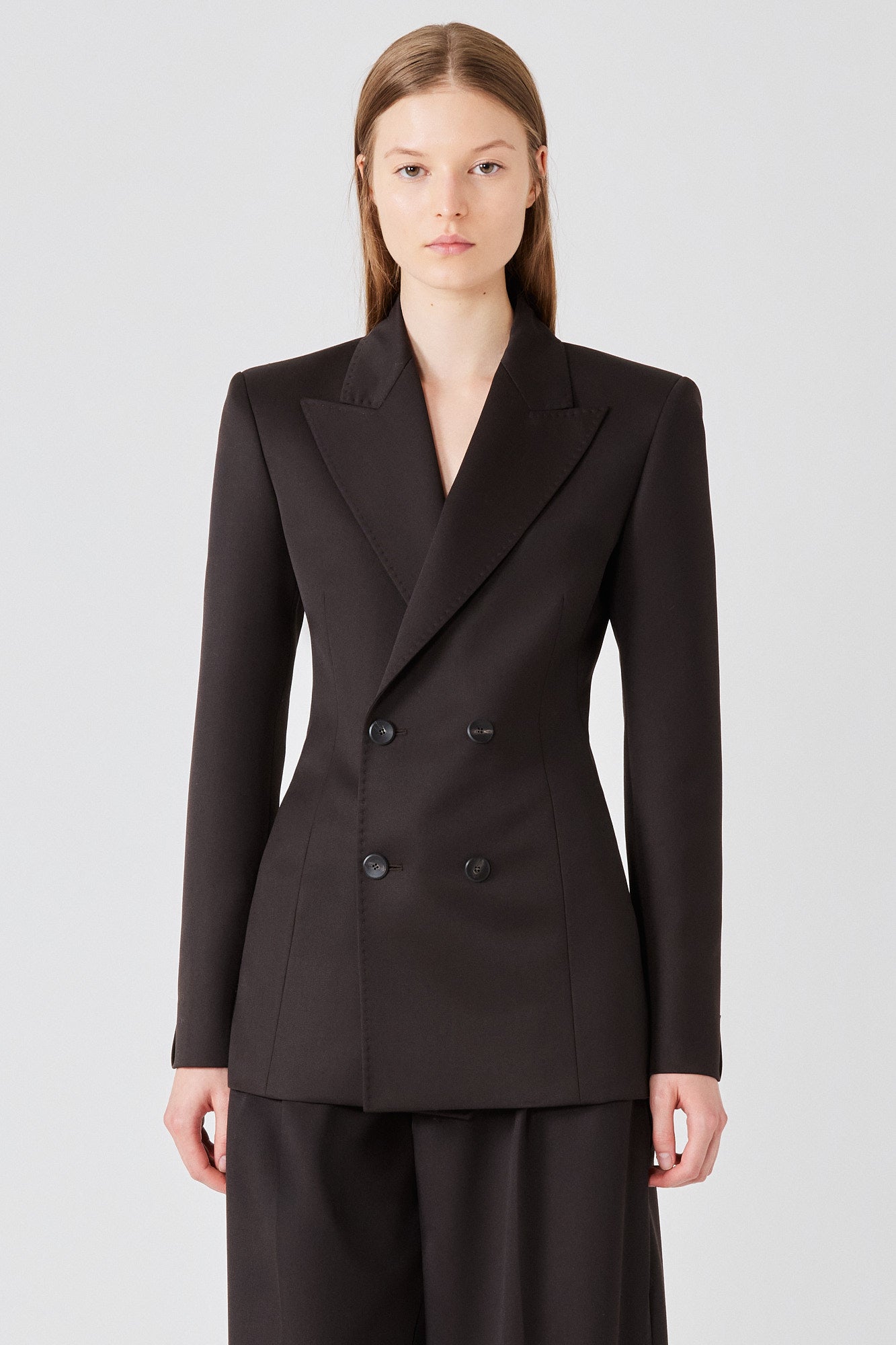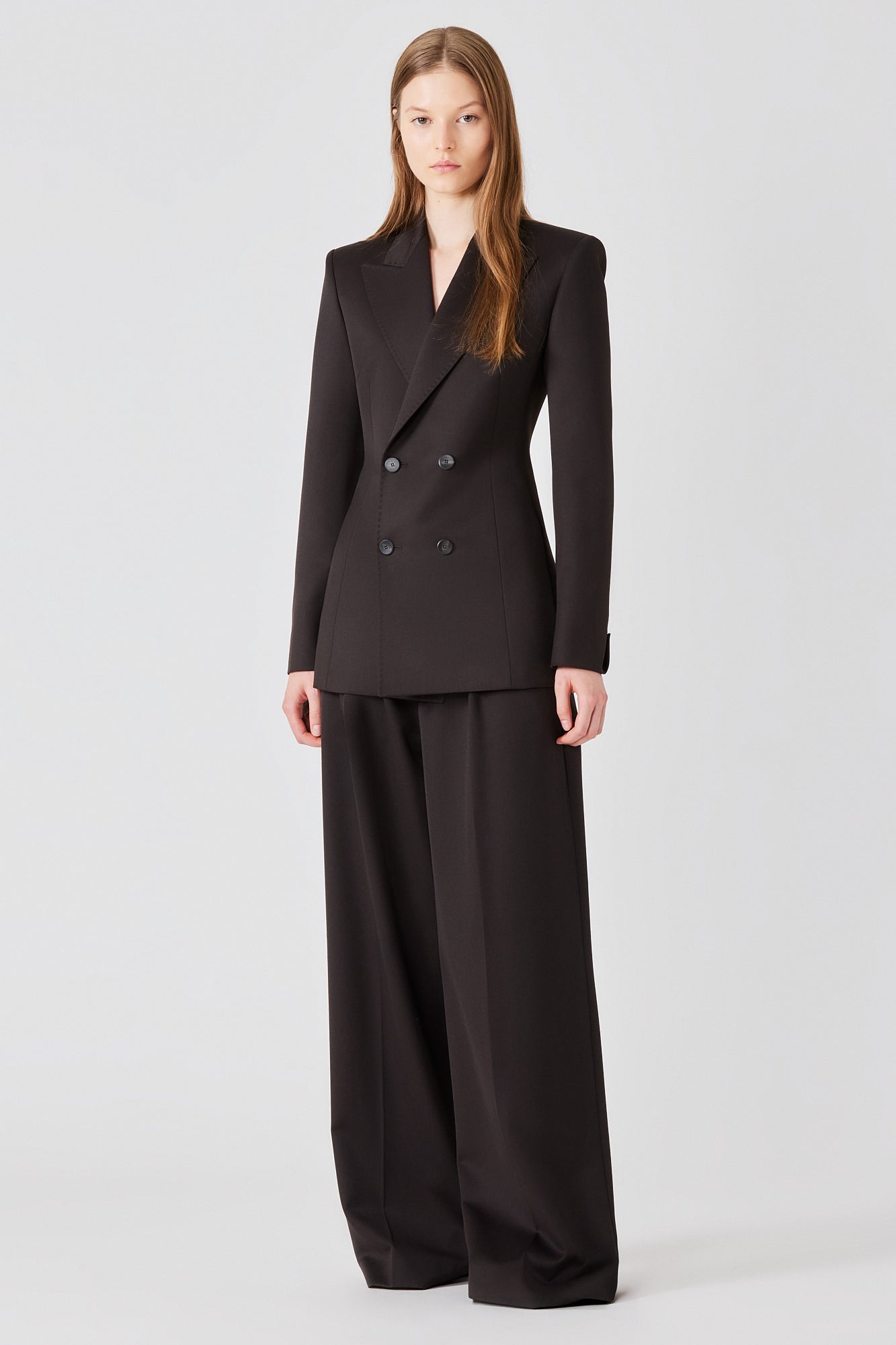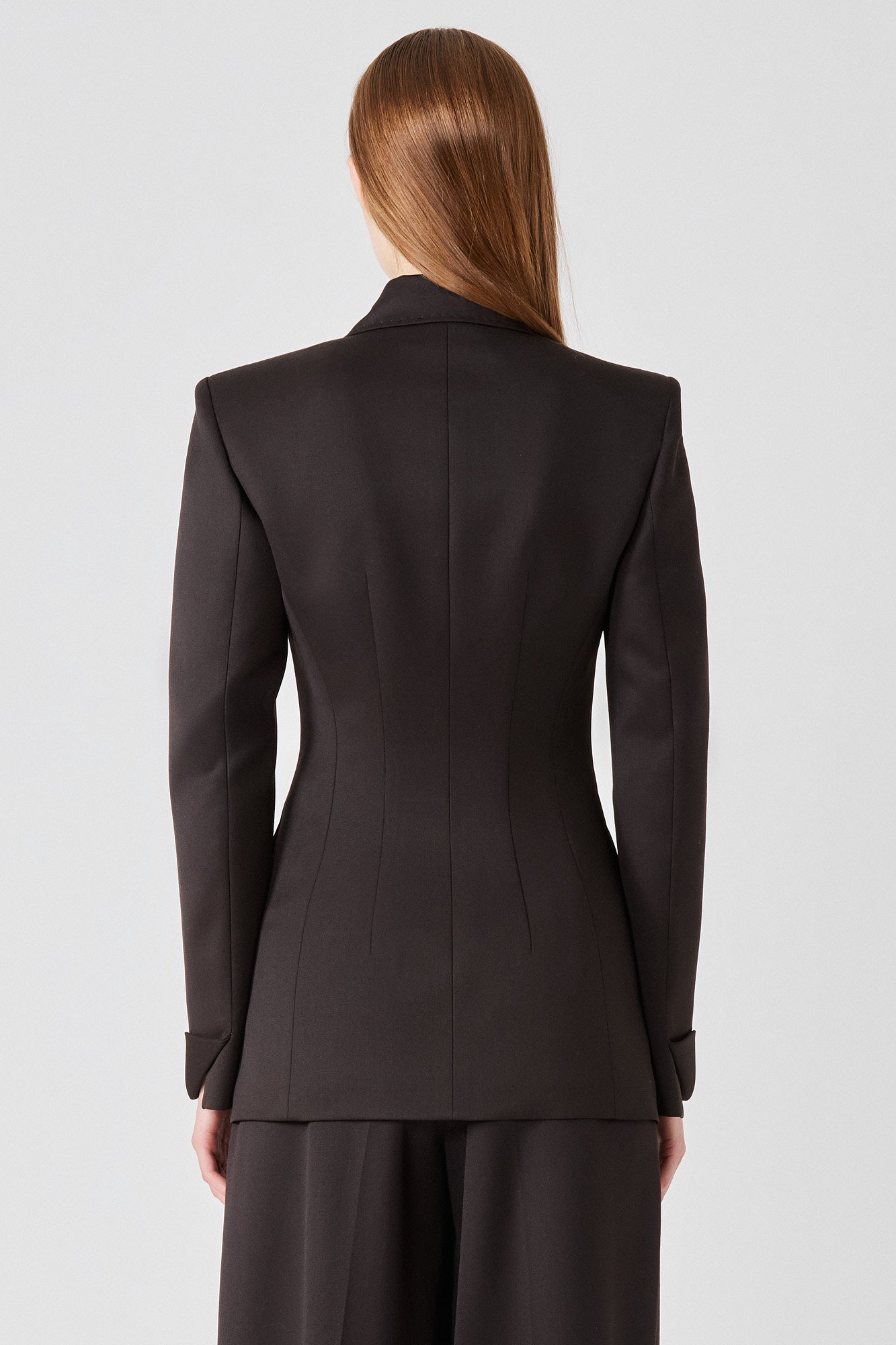 La giacca da smoking è progettata con un frontale doppiopetto affilato e spalle leggermente strutturate. La silhouette allungata e le linee pulite trovano un equilibrio tra tradizione e modernità. Abbinala ai pantaloni coordinati per un completo composto e d'effetto, oppure indossala sopra un maglione per un approccio a strati più rilassato ma raffinato.