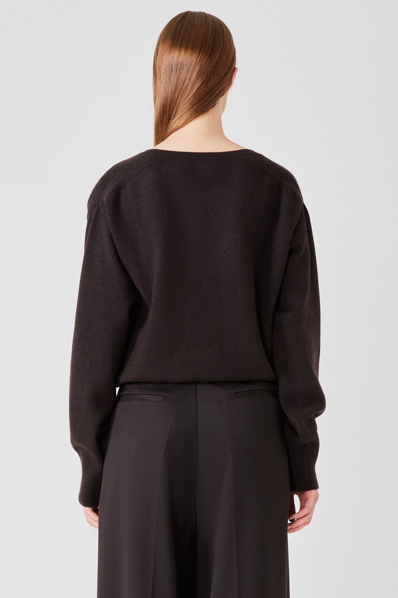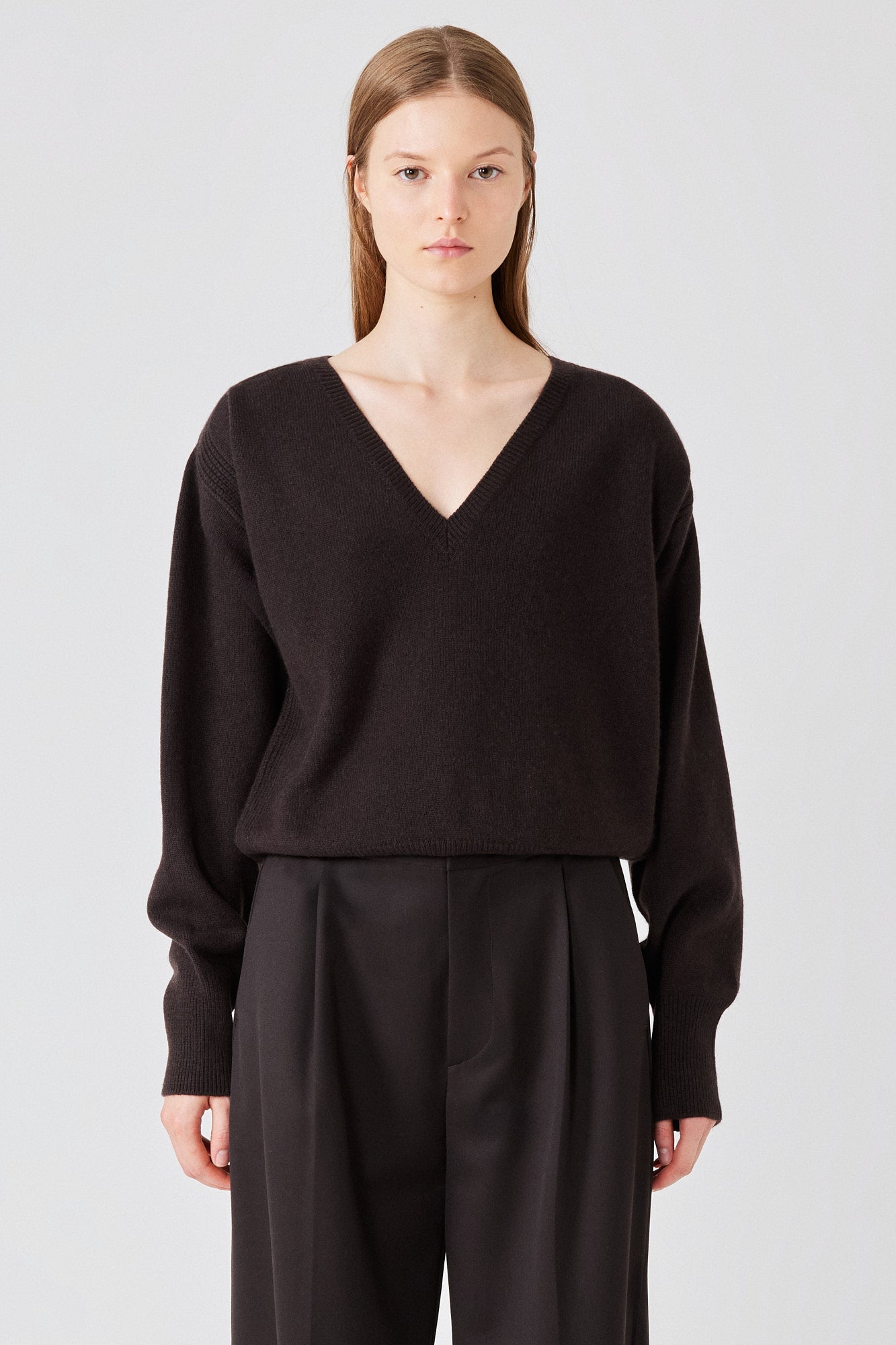 Un capo essenziale in maglieria senza tempo, questo maglione in puro cashmere è progettato per un'eleganza senza sforzo con una texture morbida e lussuosa e una silhouette rilassata. La profonda scollatura a V crea un look allungato e femminile, perfetto da indossare a strati o da solo come dichiarazione di eleganza discreta. Polsini e orlo a coste aggiungono una struttura sottile, mentre la maglia calda garantisce versatilità tutto l'anno. La caduta fluida lo rende ideale da infilare in pantaloni sartoriali o da indossare sciolto sopra silhouette a gamba larga per un'estetica moderna e disinvolta. Abbinalo a un completo in lana per un contrasto raffinato.