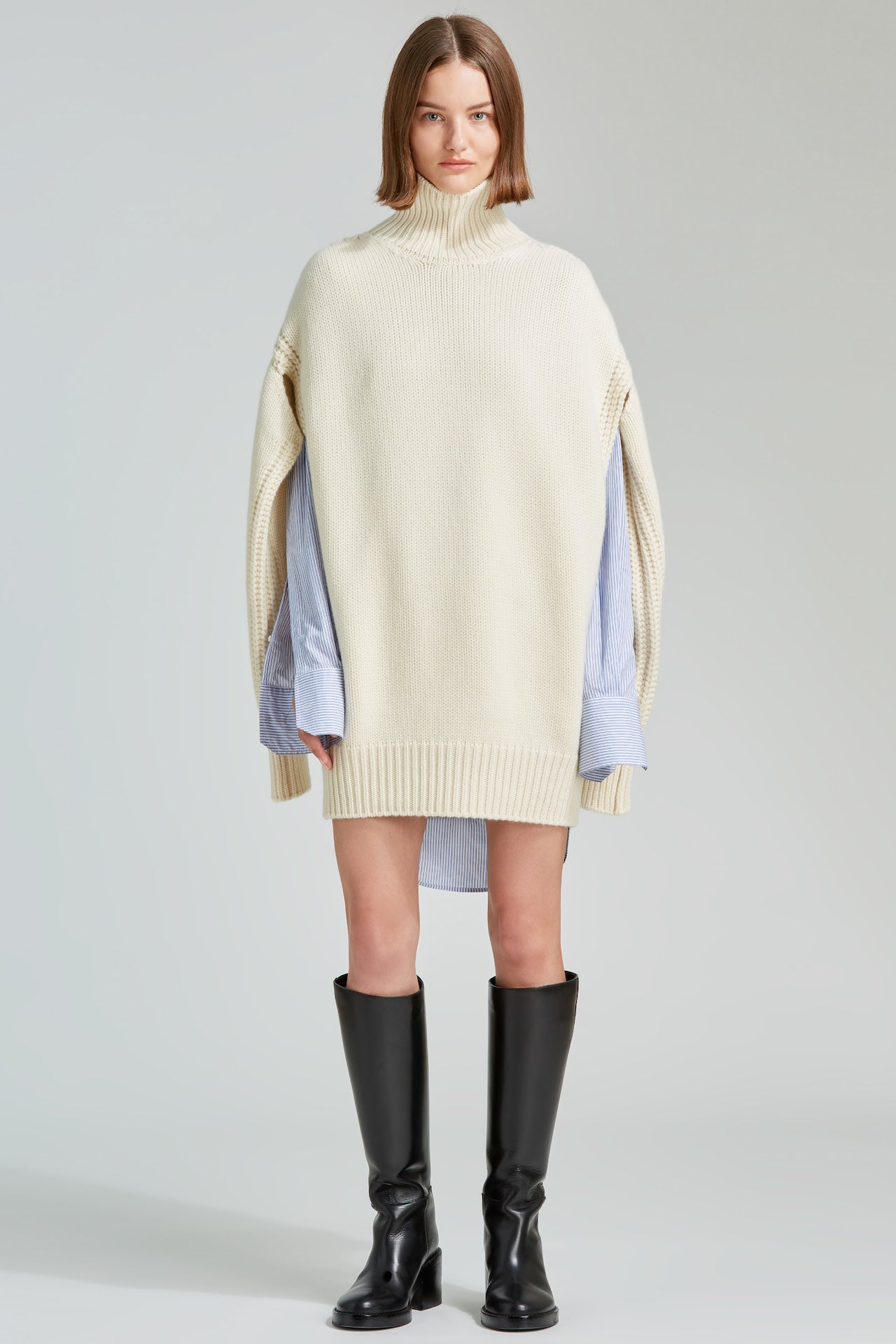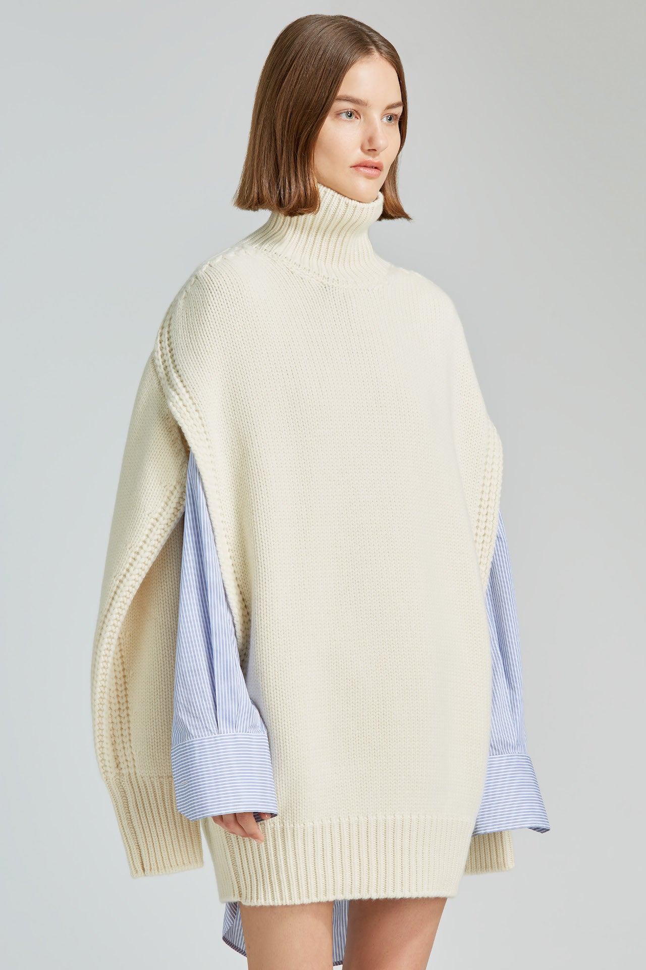 La funzionalità è migliorata dagli spacchi laterali che permettono di utilizzare il capo con o senza maniche. Perfettamente versatile, può essere indossato da solo come abito o sopra i pantaloni come maglione oversize. Riconoscibile per il dettaglio a coste inglesi doppie, firma di SASUPHI, sulle spalle e lungo i lati.