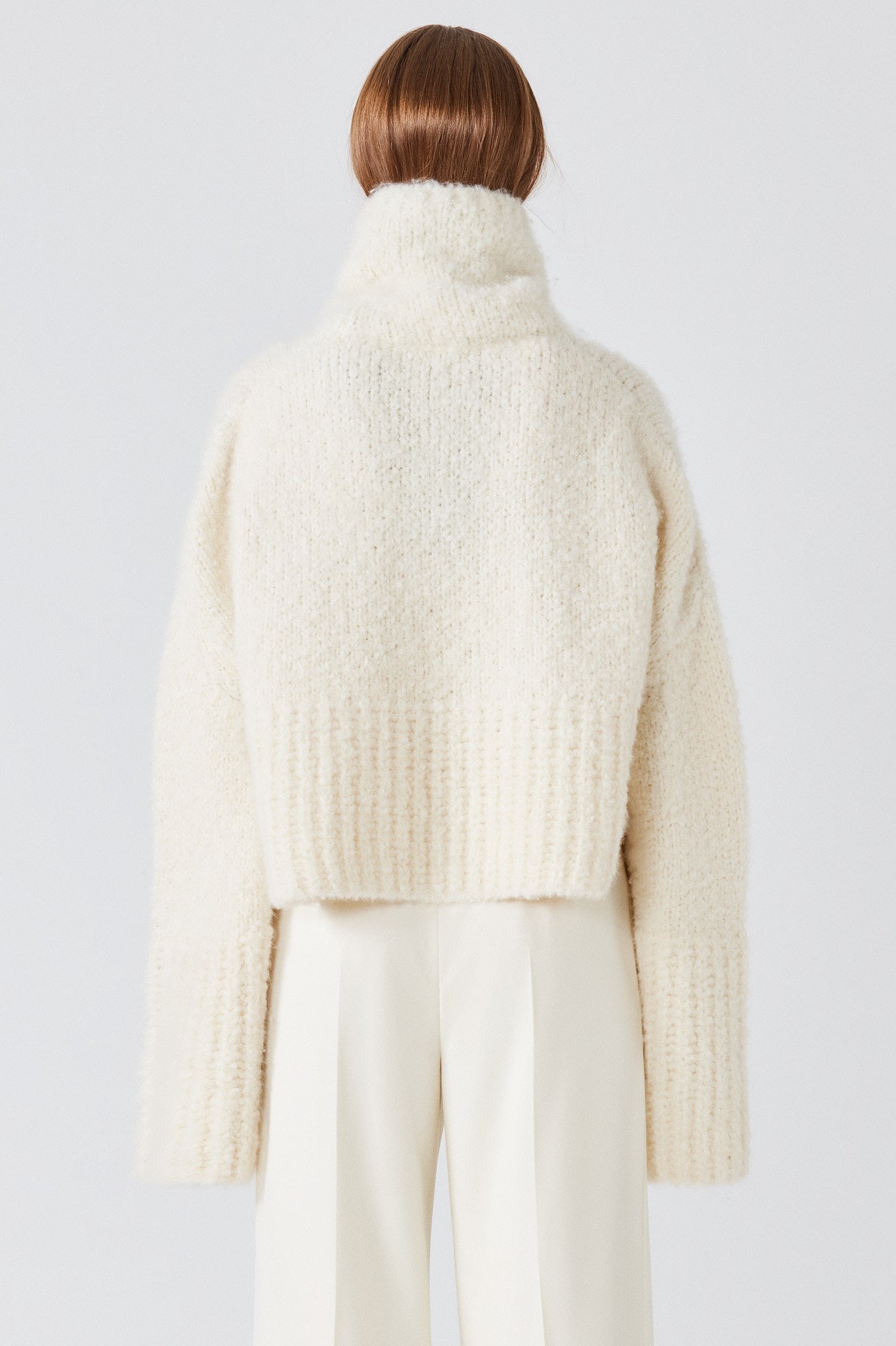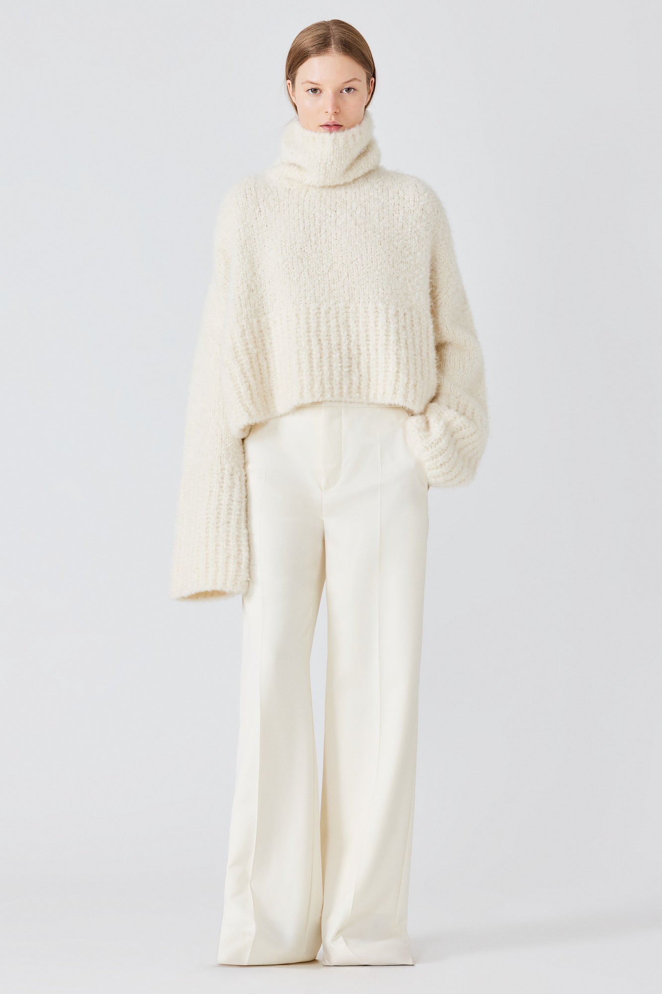 Realizzato con un morbido mix di cashmere, alpaca e seta, il maglione Teddy a collo alto offre un calore generoso e una morbidezza tattile. La vestibilità oversize, il collo alto e le spalle scese creano una silhouette avvolgente, mentre le ampie rifiniture a coste su polsini e orlo aggiungono una struttura sottile. Un capo di lusso da indossare a strati, progettato per comfort e praticità: abbinalo a jeans in denim o pantaloni di lana per un look quotidiano sofisticato, oppure con pantaloni di seta per un outfit serale più elegante.