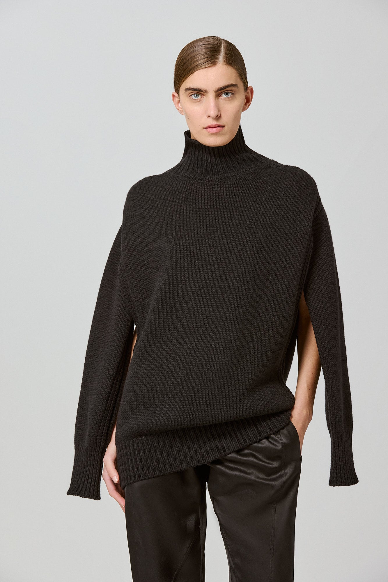 Use as an oversized sweater or as a knit dress. With sleeves or sleveless. Wear loose or belted in the front through the side slits to emphasise the waist.