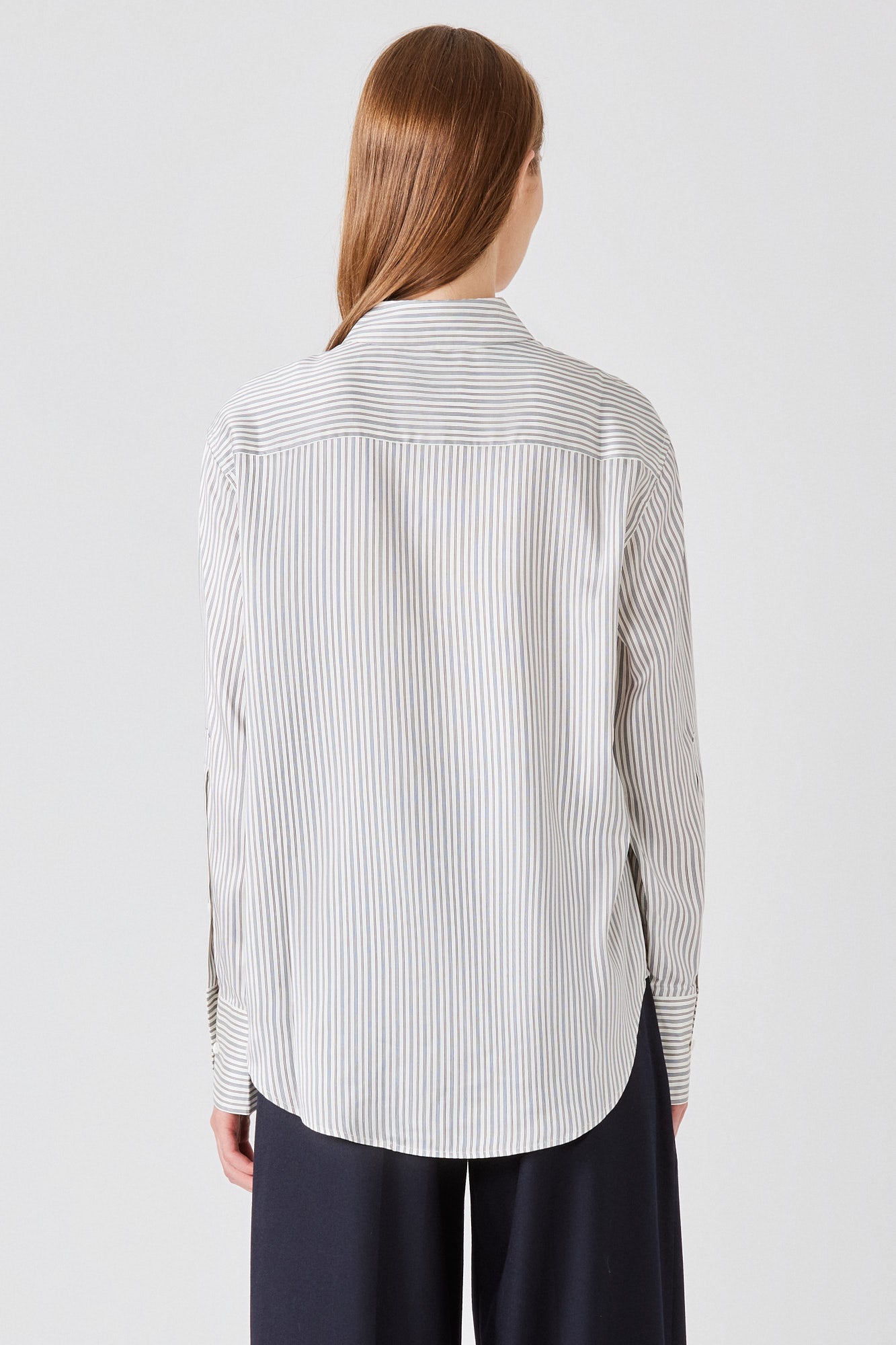 Un capo essenziale raffinato, la Camicia Marcella è realizzata in 100% seta per una finitura fluida e raffinata. La vestibilità regolare e la sottile riga blu navy offrono una sofisticazione senza tempo, mentre il tessuto leggero garantisce una caduta e un comfort senza sforzo. Prodotta in Italia, è un capo fondamentale per uno stile sia sartoriale che casual.