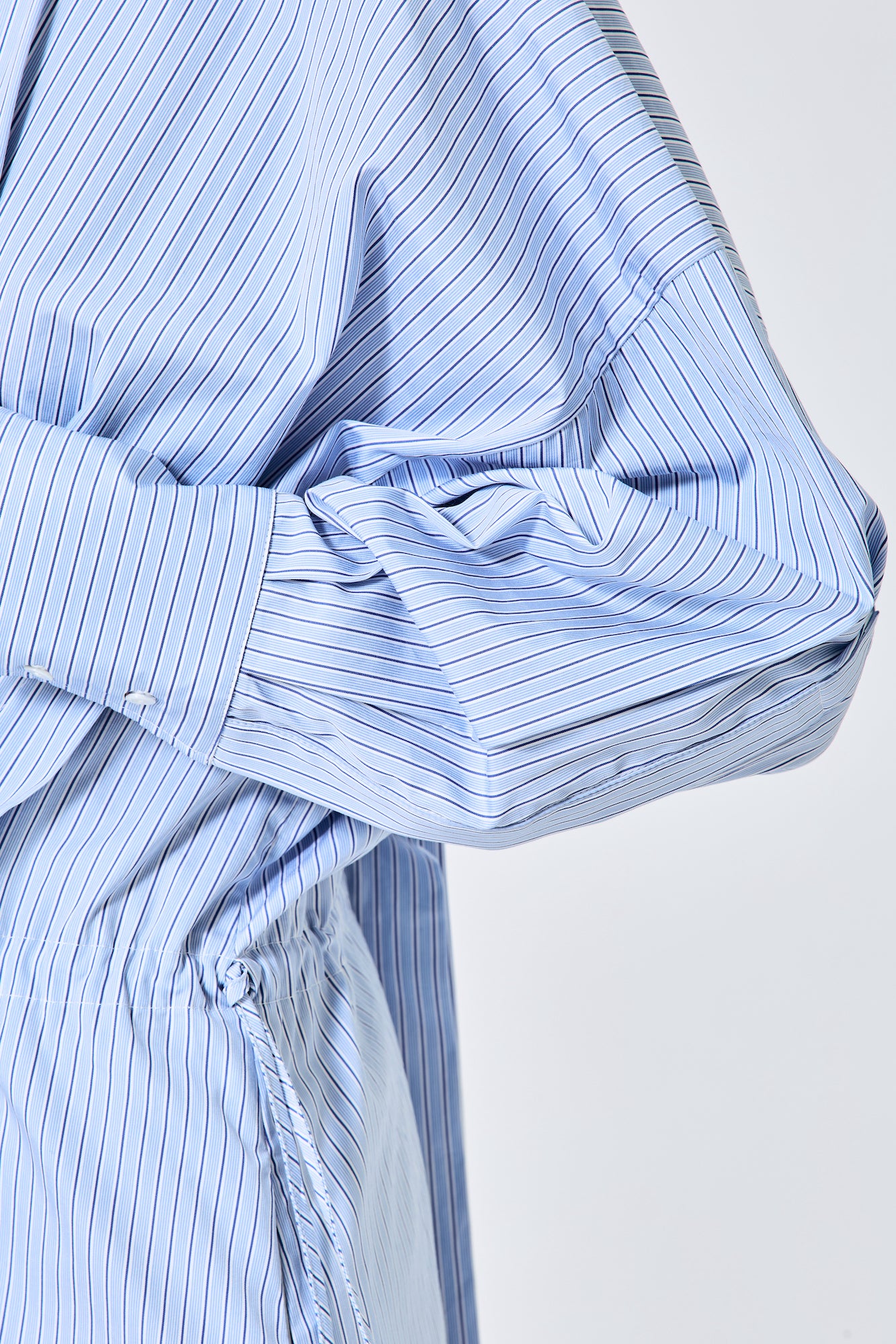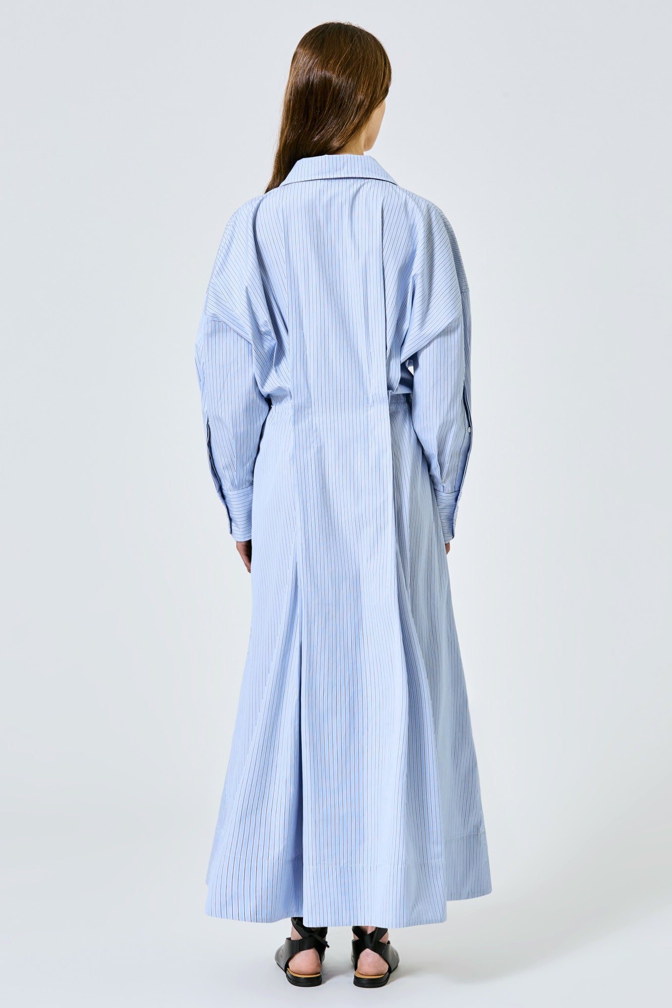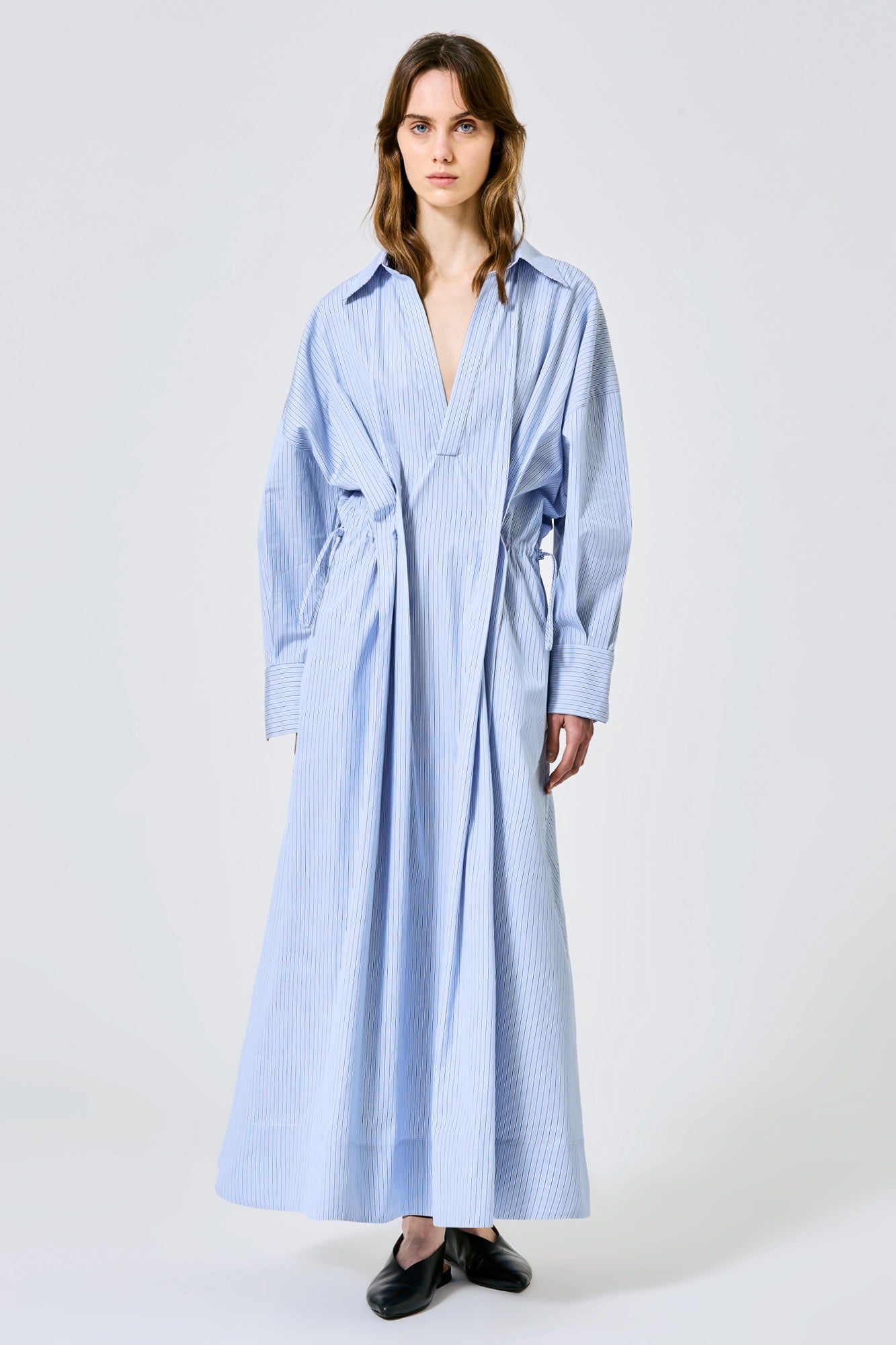 Abito lungo a V in popeline di cotone con grandi pieghe esterne davanti e dietro e lacci in vita