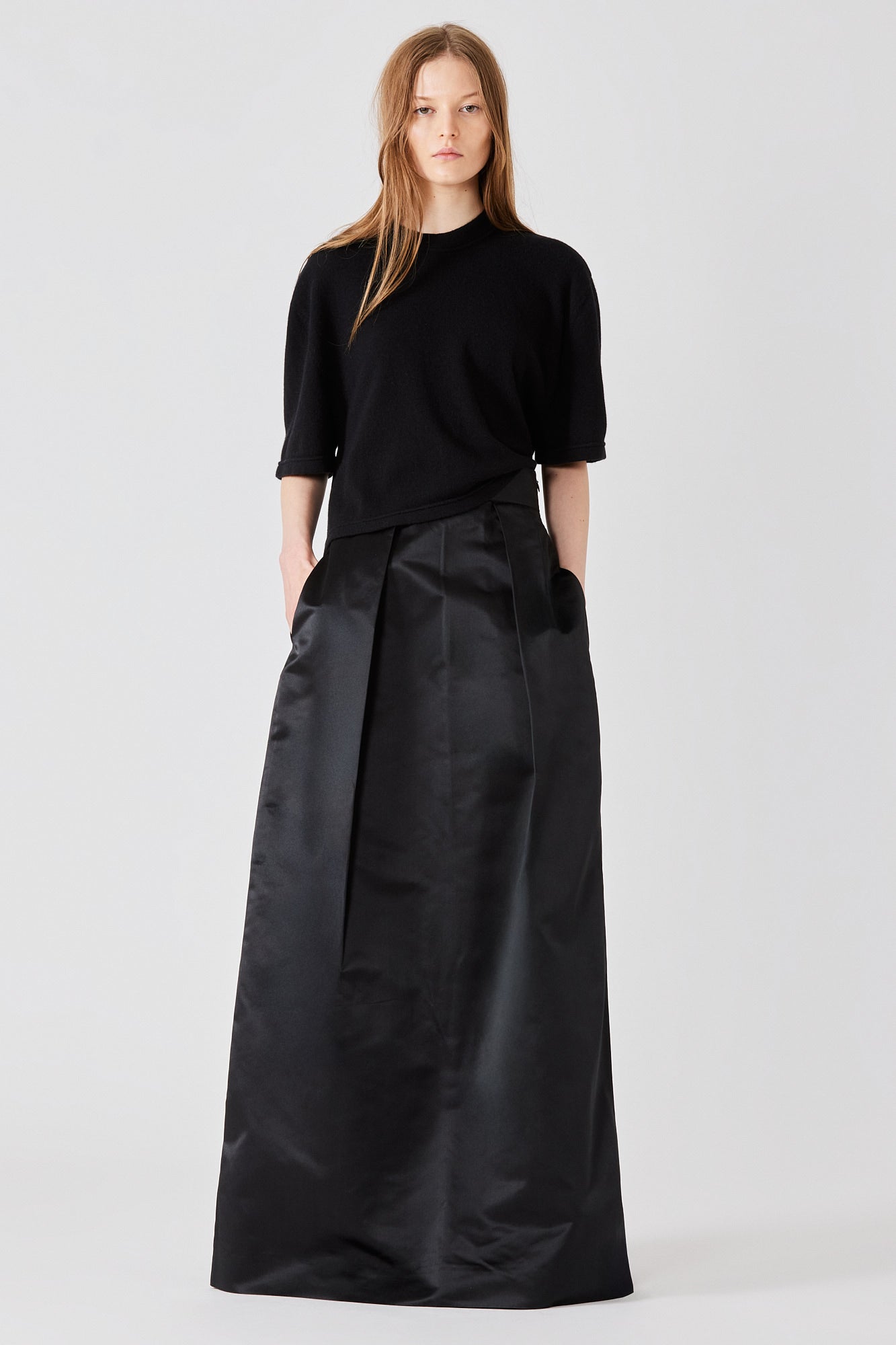 Knitted from pure cashmere, the Cropped T-Shirt features a relaxed silhouette with short sleeves and a classic crew neckline. The soft drape and minimalist design lend effortless ease, making it ideal for casual layering or refined everyday wear. Pair it with high-waisted trousers or skirts for a modern, balanced look.