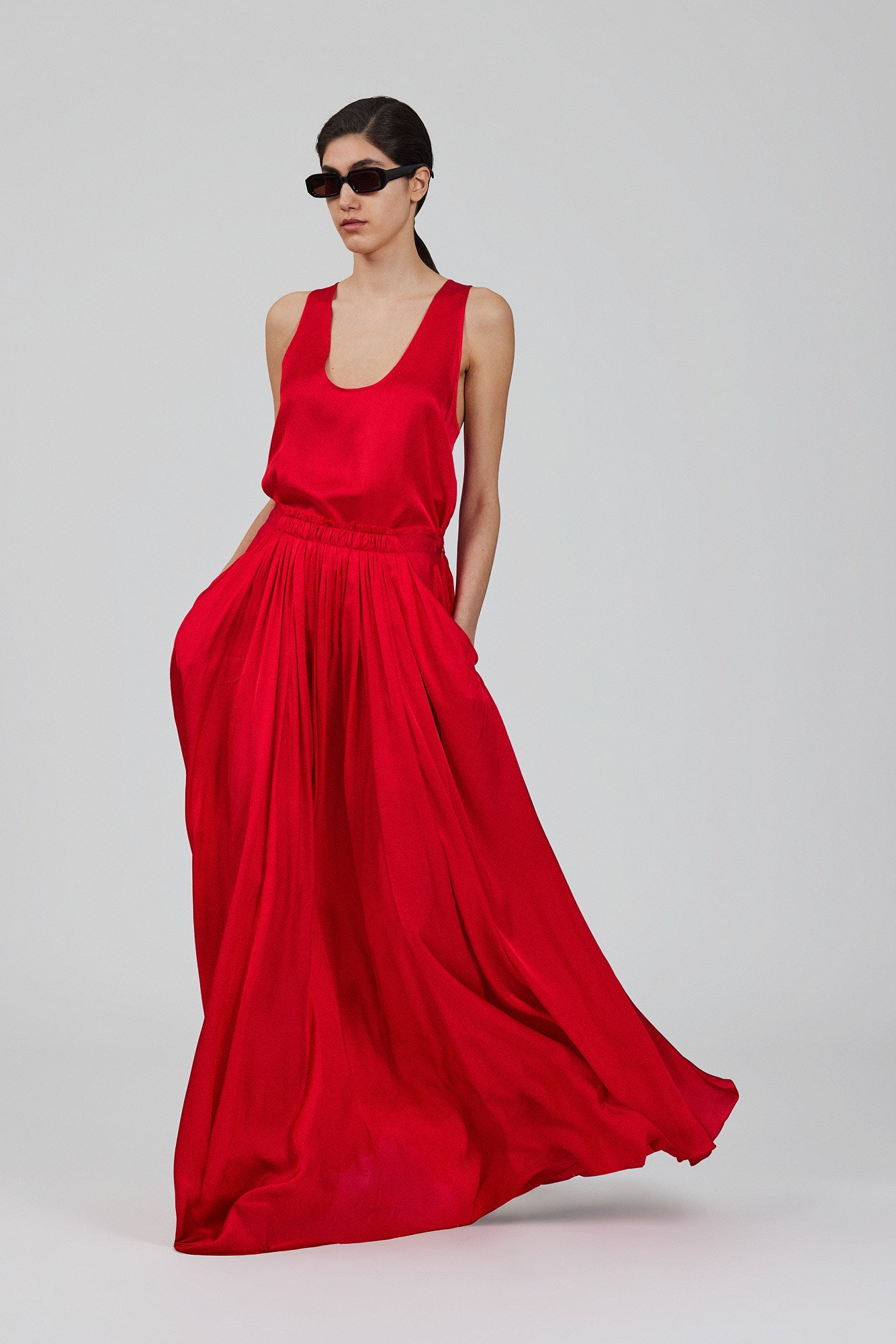 A timeless expression of refined elegance, this maxi skirt is crafted from lightweight viscosa, offering a fluid silhouette. The high-waisted fit accentuates the waist, while the subtle flare adds graceful movement. Designed with side pockets for a modern touch, this piece balances tailored sophistication with everyday ease.