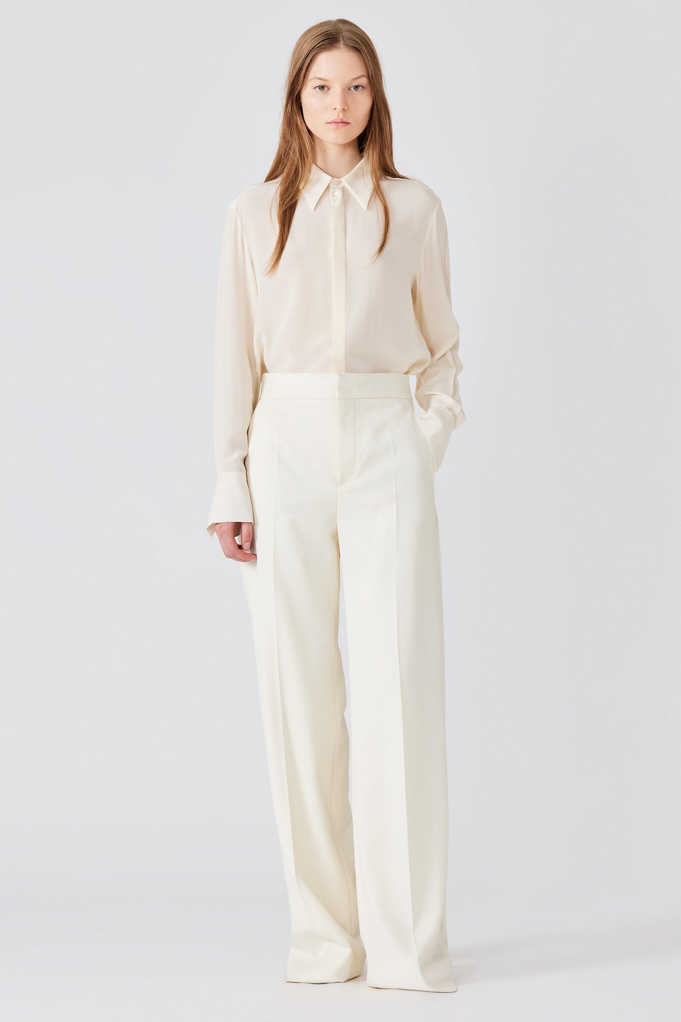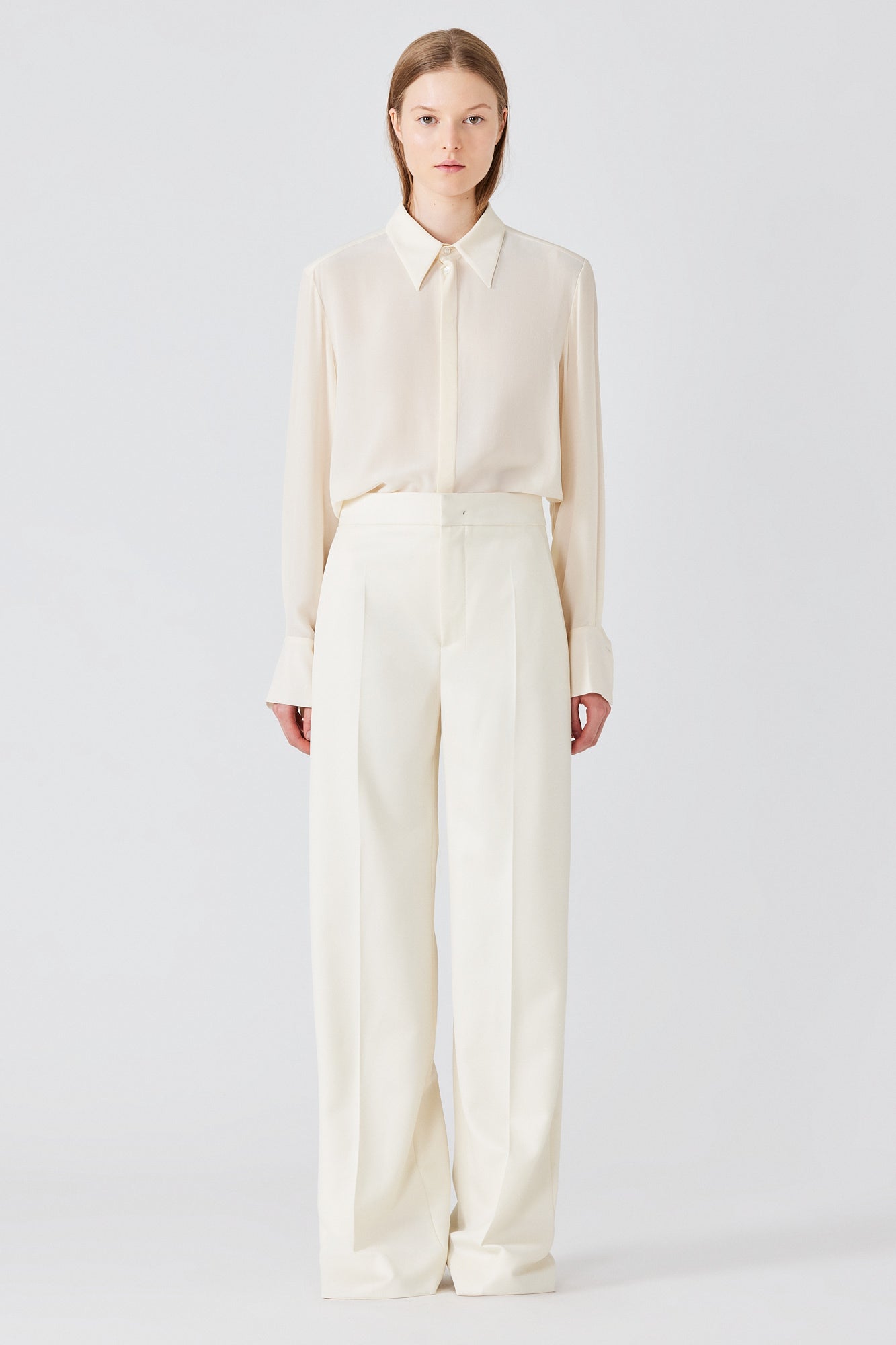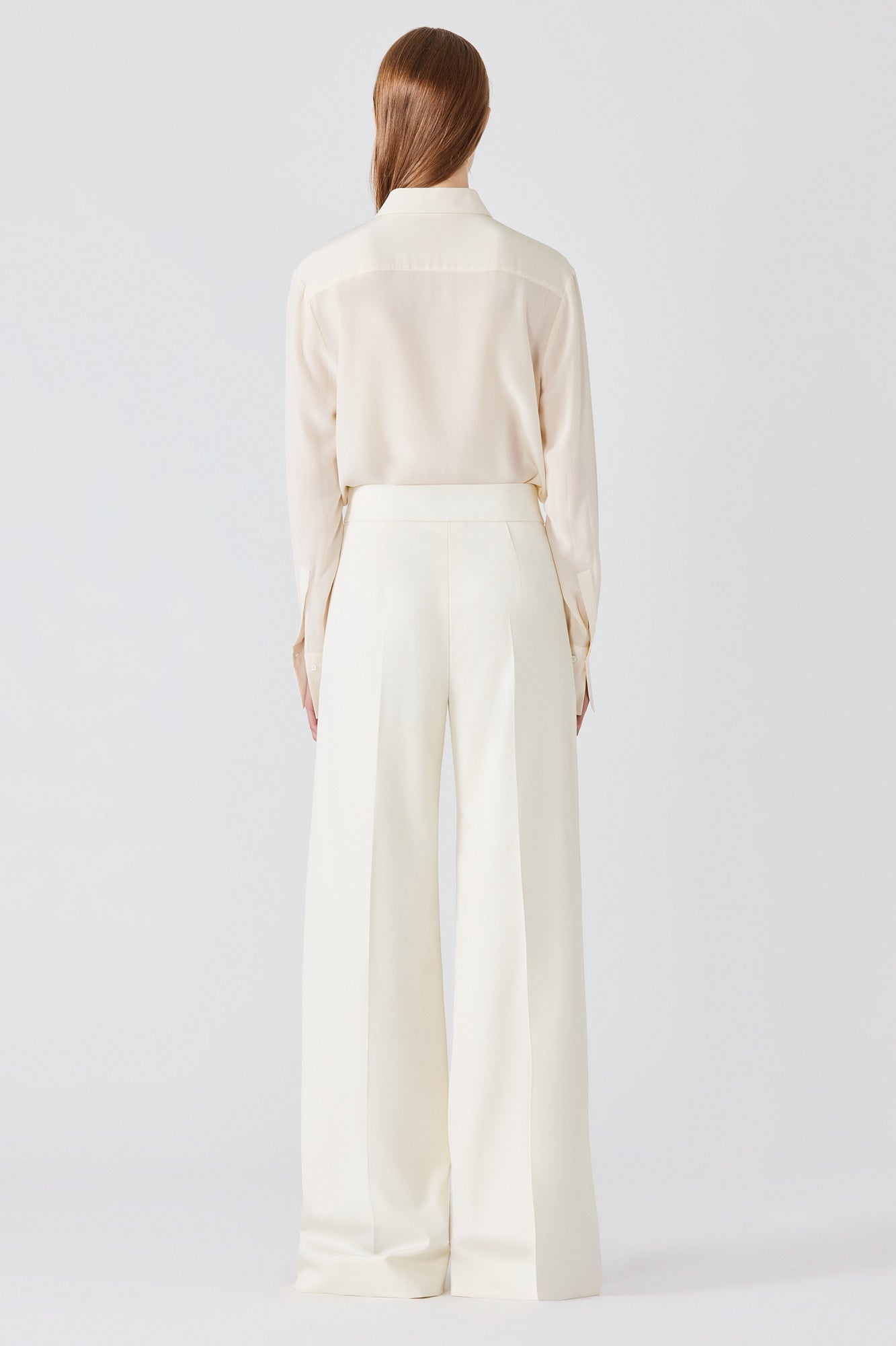 Crafted from pure wool, the Tuxedo Trousers feature a high-rise waist and refined straight-leg cut. The clean silhouette is elevated by a fluid drape, offering a tailored elegance, ideal for sharp daytime looks, formal occasions, or minimalist eveningwear.